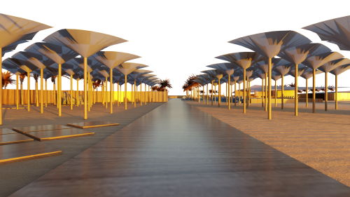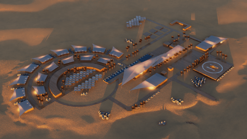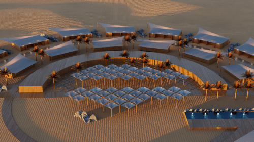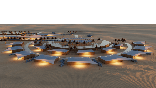 The desert is an expansive and ever-changing canvas, a backdrop where the moon rises magnificently, inspiring this temporary hotel project. Designed to be assembled and disassembled, this hotel is an ode to transience and the unique beauty of the lunar landscape. The circular shape of the rooms echoes the symbolism of the moon, strategically arranged to offer panoramic views of the desert. The project scope embraces the idea of comfort and connection with the outdoors. There are designated areas for staff, services, and reception, while the rooms, each with its private balcony, allow guests to enjoy the tranquility of the desert. The option to integrate rooms offers flexibility to accommodate larger families while maintaining a unique and comfortable experience. For relaxation and entertainment, the hotel provides leisure spaces, restaurants with outdoor dining areas, taking advantage of the starry nights in the desert. There is also a dedicated space for camels, allowing guests to enjoy rides in the dunes and discover the uniqueness of the desert environment. Additionally, there is a majlis, a traditional gathering space, where guests can come together, share stories, and experiences. Beyond just accommodation, this project provides a celebration of nature and the magic the desert has to offer.