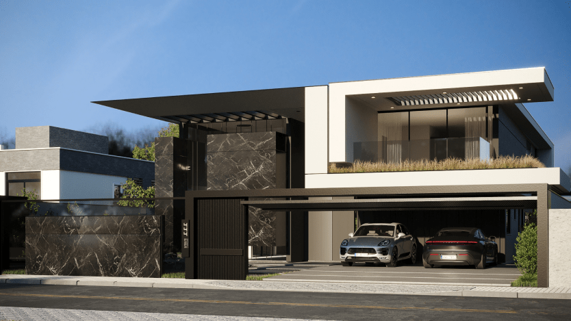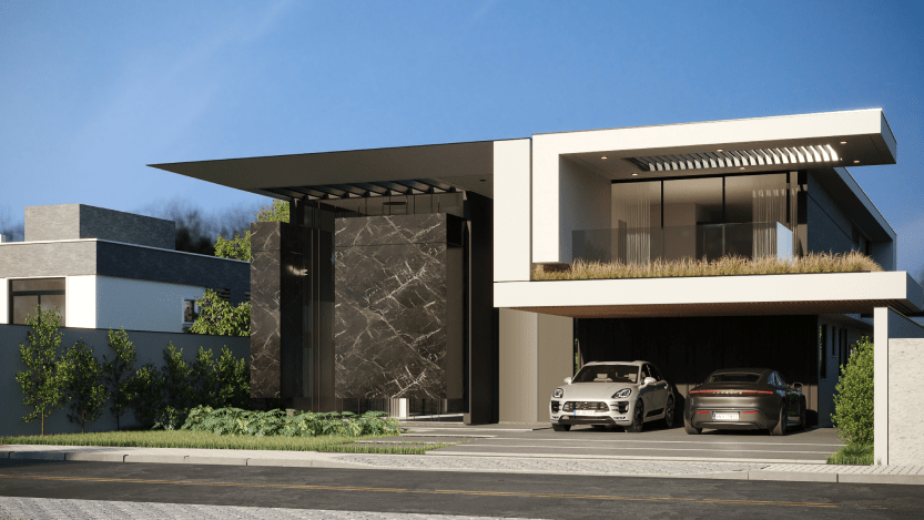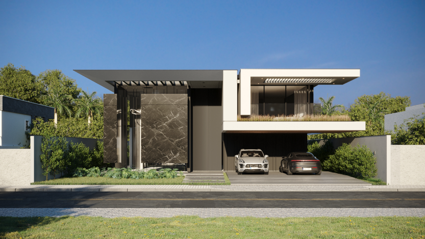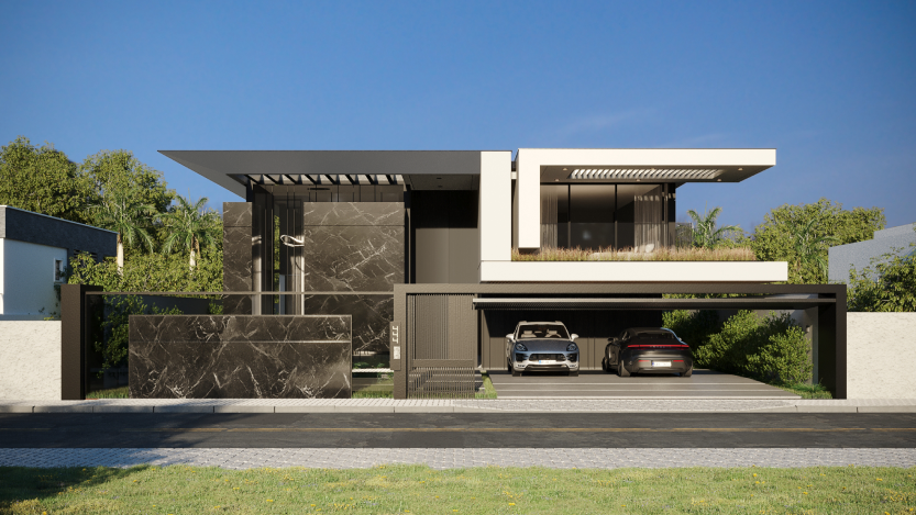 Residence MA, located in Ceu Azul–Paraná, the design of thisresidential project focuses on creating a comfortable and privatespace for a family with two children. The house includes foursuites, an open plan living area, and anoutdoor access area toreceive guests in the party/gourmet space.To take advantage of the local climate, the design incorporatesdark color elements as a passive heatingstrategyduring the coldwinters in the city. Large windows and outdoor livingspaces alsoallow the homeowners to enjoy the beautiful views of thesurrounding area.The use of the chamfer element with voids and pergolas createsa light and shadow effect that adds visual interest and helps todraw the eye to different parts of the facade. The use of naturalstone, particularly a local Brazilian variety, adds a natural andorganic touch to the design and helps to highlight the connectionto the surrounding environment.Overall, this house combines function and form to create a stylishand comfortable home that meets the needs of the family andtheir guests.