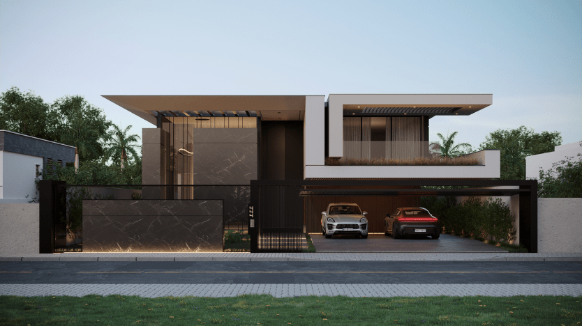 Residence MA, located in Ceu Azul–Paraná, the design of thisresidential project focuses on creating a comfortable and privatespace for a family with two children. The house includes foursuites, an open plan living area, and anoutdoor access area toreceive guests in the party/gourmet space.To take advantage of the local climate, the design incorporatesdark color elements as a passive heatingstrategyduring the coldwinters in the city. Large windows and outdoor livingspaces alsoallow the homeowners to enjoy the beautiful views of thesurrounding area.The use of the chamfer element with voids and pergolas createsa light and shadow effect that adds visual interest and helps todraw the eye to different parts of the facade. The use of naturalstone, particularly a local Brazilian variety, adds a natural andorganic touch to the design and helps to highlight the connectionto the surrounding environment.Overall, this house combines function and form to create a stylishand comfortable home that meets the needs of the family andtheir guests.